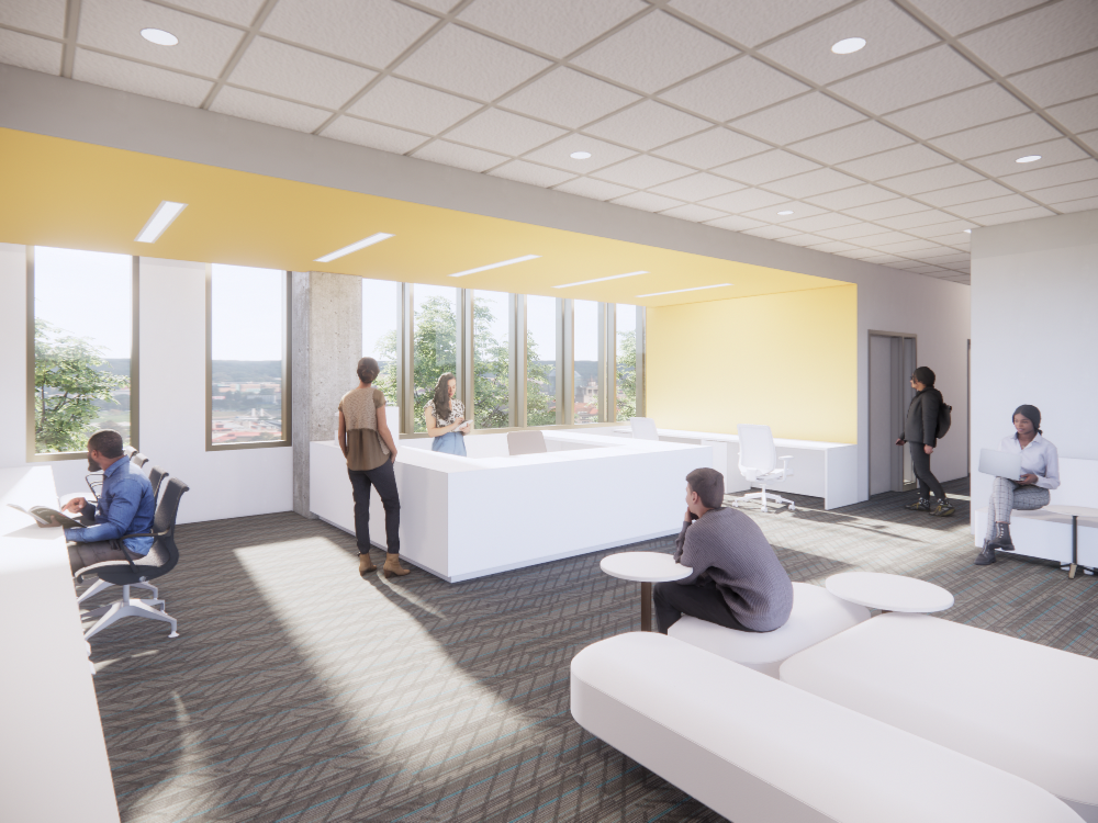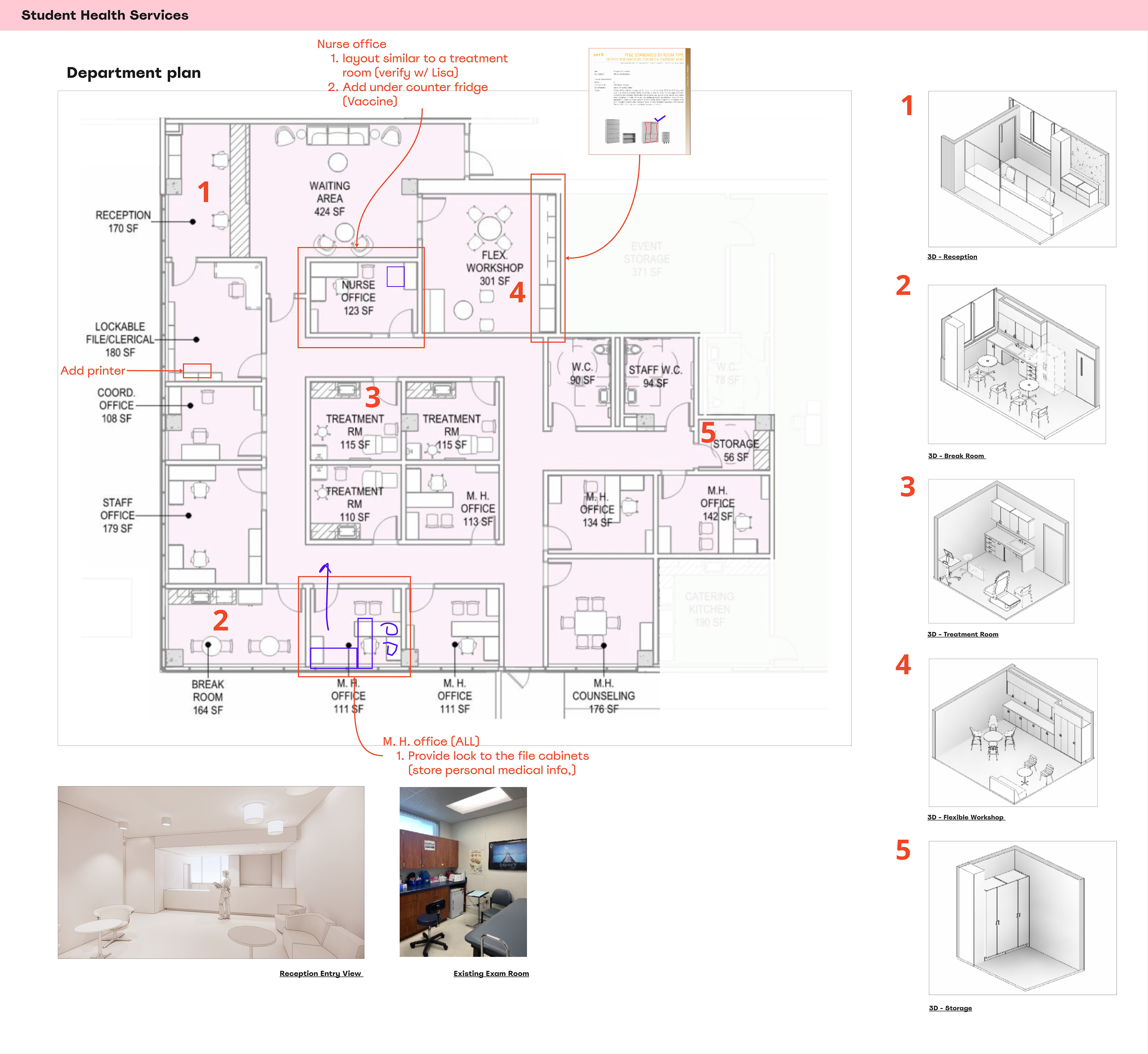Reception, Waiting room, Exam rooms, Mental health counseling, Staff support spaces, Patient restrooms, Storage.